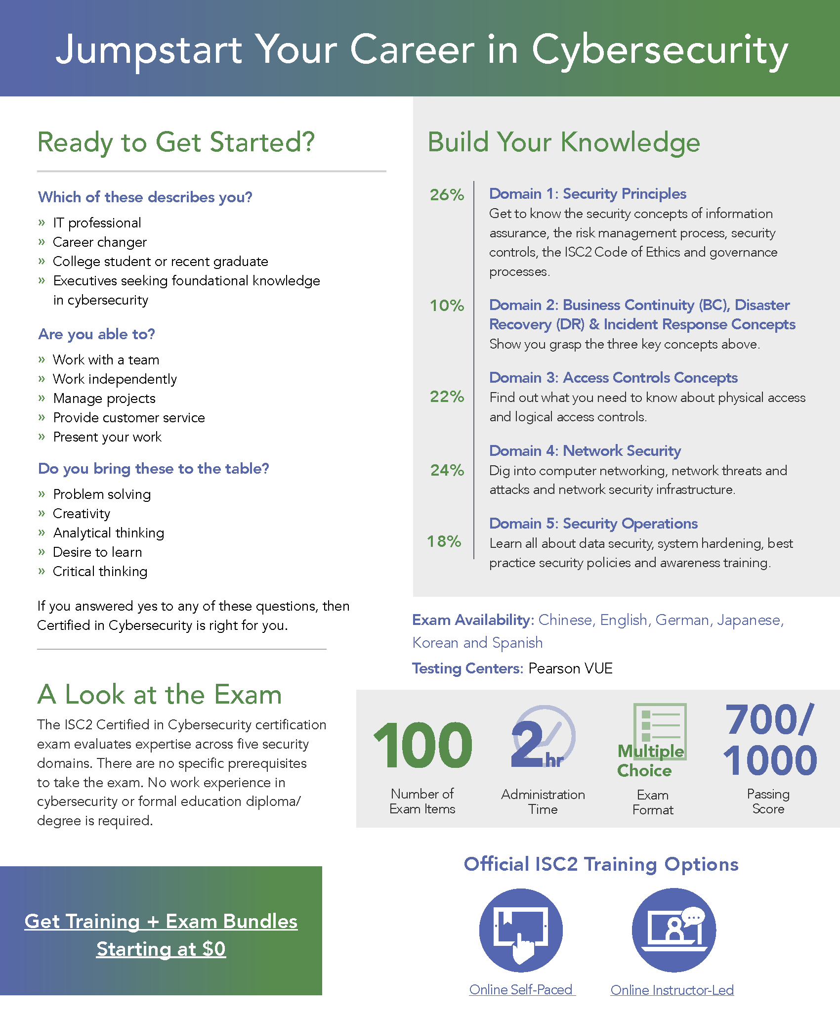 There is no work experience requirement to earn the Certified in Cybersecurity (CC). The course provides a review of the subject matter published in the Certified in Cybersecurity exam outline, which shares the security domains on which certification candidates will be evaluated: